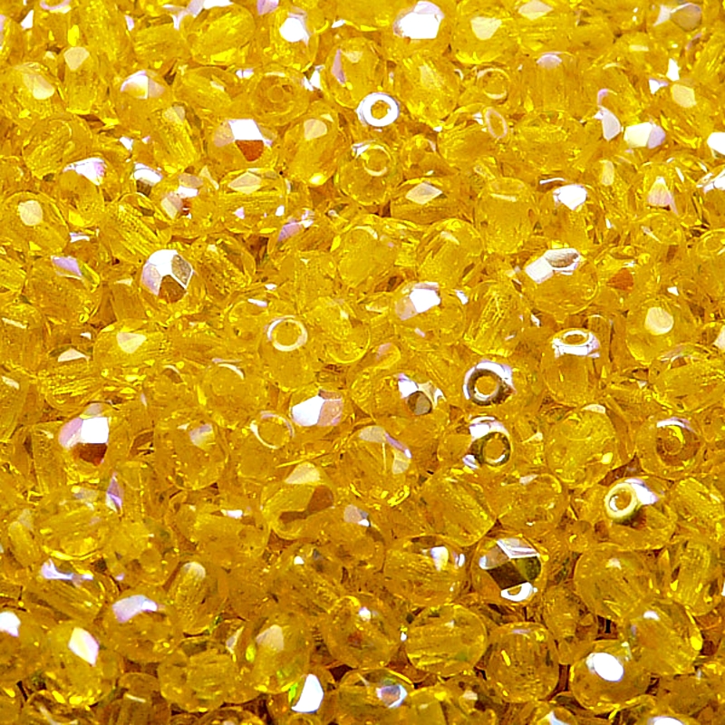 Чешские стеклянные гранёные бусины круглые 4мм жёлтые с покрытием AB радужные полупрозрачные.