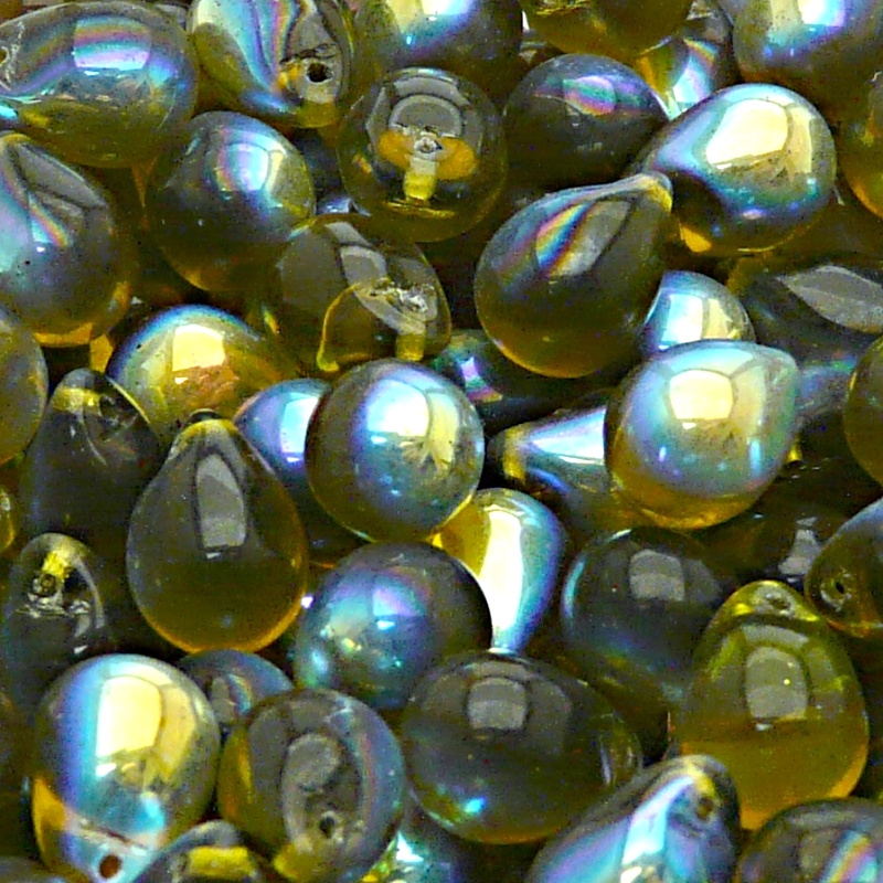 10шт Чешские стеклянные штампованные (прессованные) бусины капли 10x14мм коричневый оливин с покрытием AB радужные полупрозрачные.