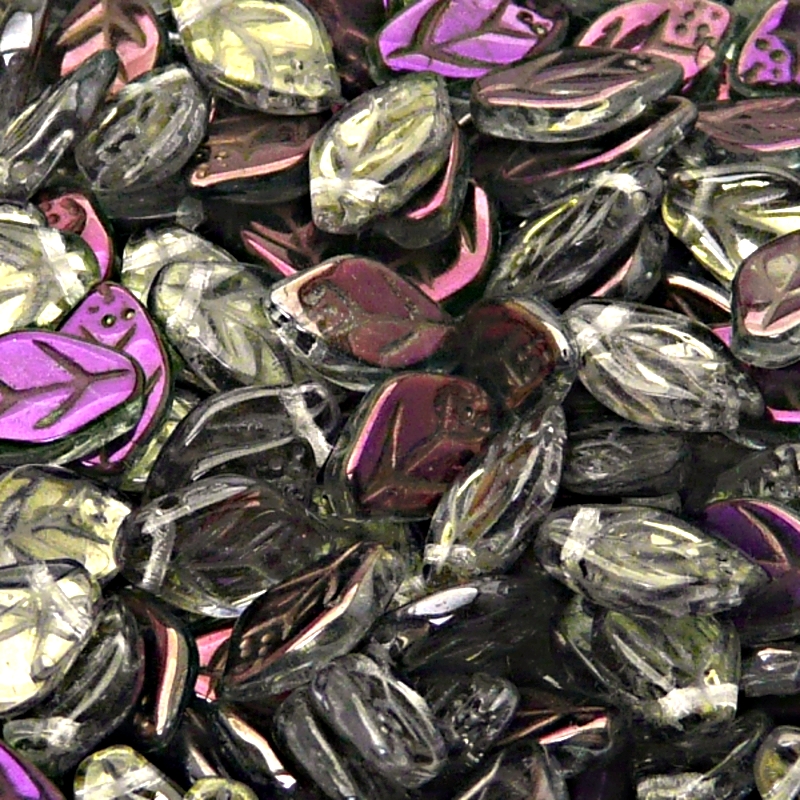 25шт Чешские стеклянные штампованные (прессованные) бусины листики с поперечным отверстием 7х12мм хрусталь с покрытием браун флер полупрозрачные.