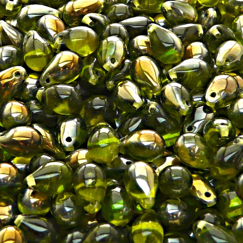 30шт Чешские стеклянные штампованные (прессованные) бусины капли 6x9мм оливин с покрытием валентинит полупрозрачные.