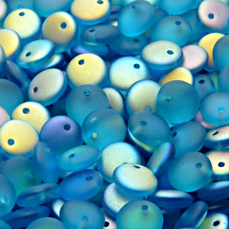 Чешские стеклянные штампованные (прессованные) бусины чечевица 8мм аквамарин с покрытием AB радужные матовые полупрозрачные.
