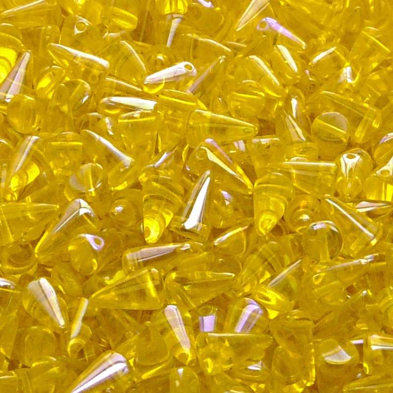 50шт Чешские стеклянные штампованные (прессованные) бусины шипы 5x8мм жёлтые с покрытием AB радужные прозрачные.