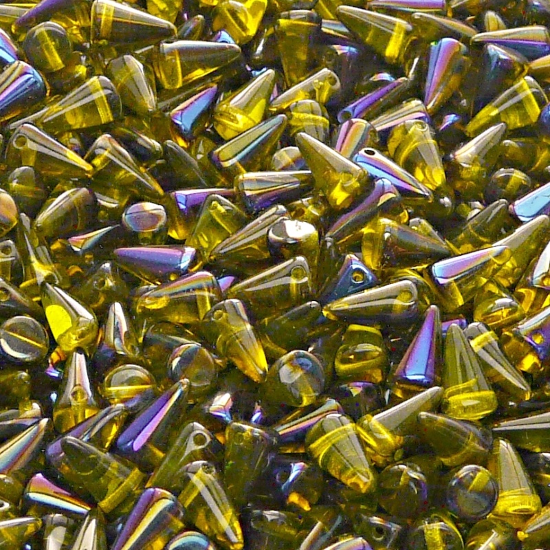 Glass Pressed Beads are one of the oldest types of beads. They are the embodiment of boundless human imagination in one of the most beautiful natural materials, traditional Bohemian glass. These were the first beads that were made here over three hundred years ago using the technique of pressing heated glass rods in a mould. Czech pressed beads in the shape of a spike are produced using the same technology as all czech glass pressed beads. Their shape is therefore reminiscent of a spike. Size 5x8mm.