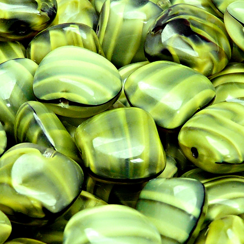 6шт Чешские стеклянные штампованные (прессованные) прямоугольные бусины в форме подушечки 13x15мм чёрно-оливиновый полосатый лунный свет непрозрачные.