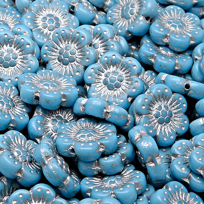 8pcs Czech Pressed Glass Flat Flower Beads 14mm Opaque Turquoise Blue Silver Fired ColorIn stock 40 qty68,00 CZK/ qty56,20 CZK VAT excluded